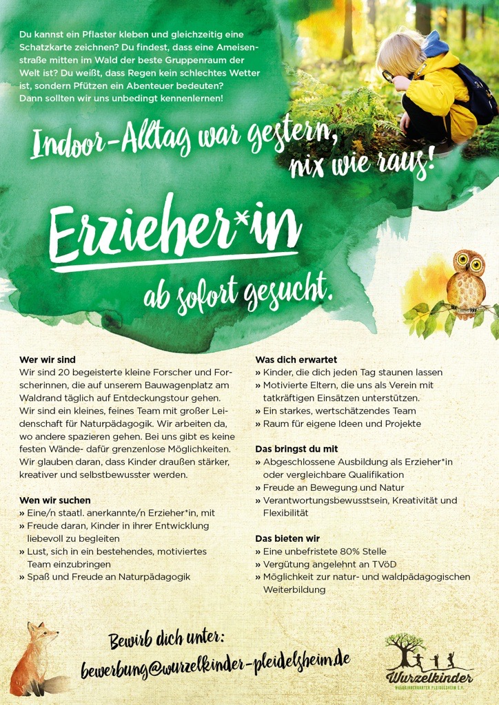 Lerne unseren Waldkindergarten auch unter www.wurzelkinder-pleidelsheim.de näher kennen. Wir freuen uns über deine Bewerbung an:
