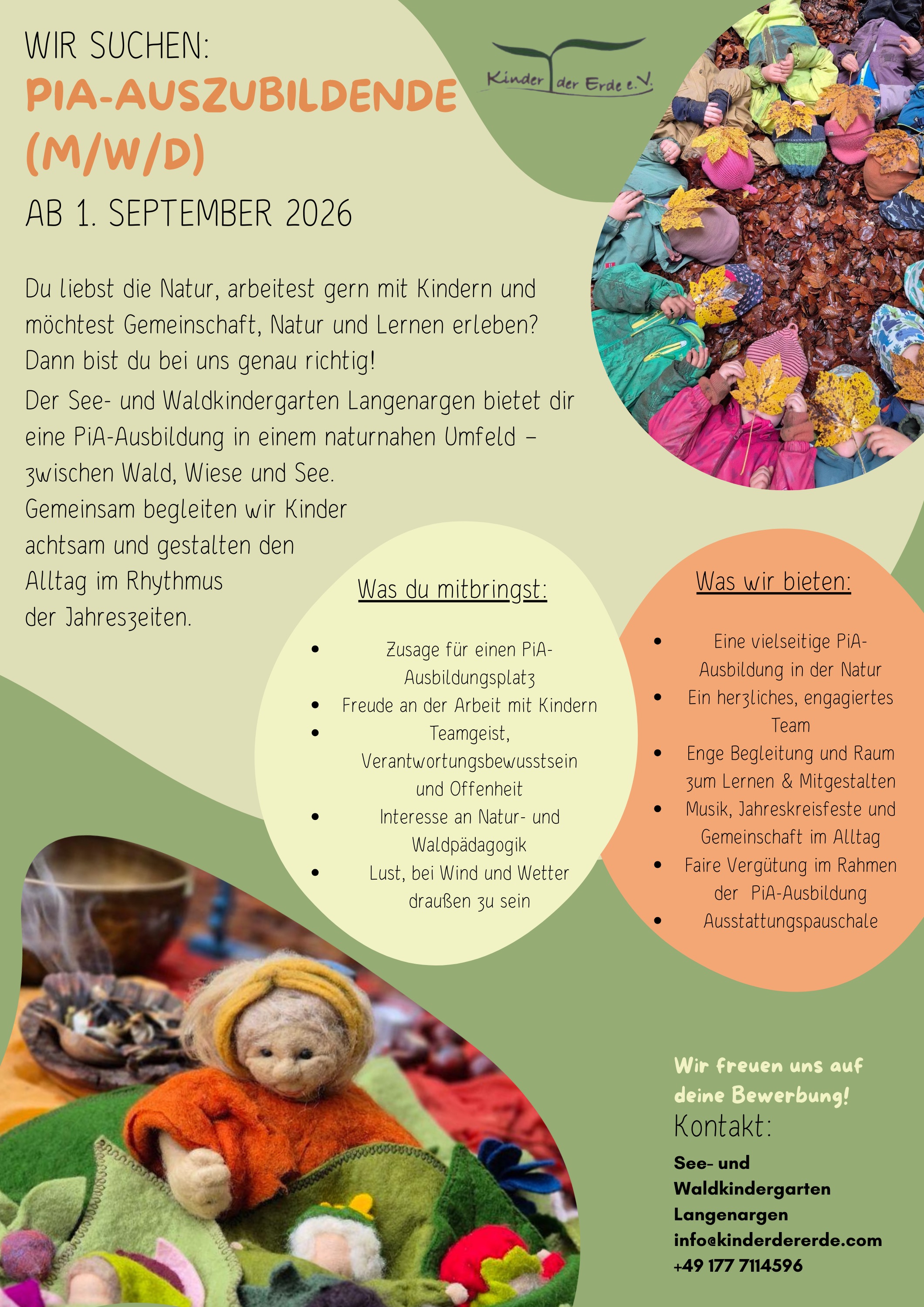 Was du mitbringst: eine Zusage für einen PiA-Ausbildungsplatz, Freude an der Arbeit mit Kindern, Teamgeist, Verantwortungsbewusstsein und Offenheit, Interesse an Natur- und Waldpädagogik sowie Lust, bei Wind und Wetter draußen zu sein.